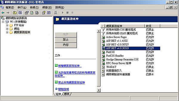 2.在 網頁服務延伸 確認 ASP.NET 4.0.30319 為 允許
