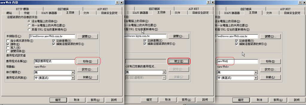 主目錄 / 應用程式名稱->移除 ->建立 ->newWeb/ 套用